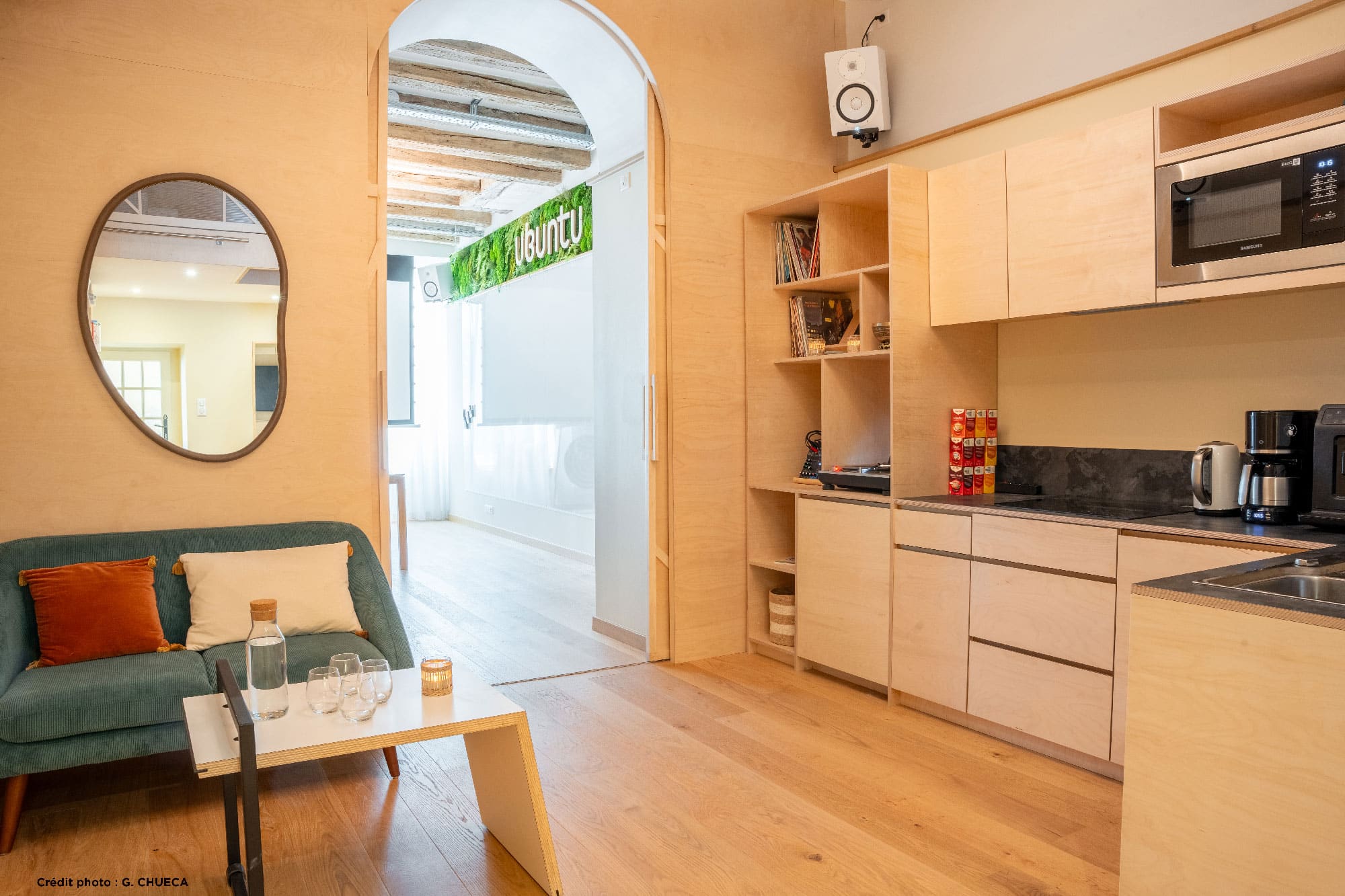 Le mobilier, conçu sur mesure au millimètre près, a été imaginé pour limiter l’emprise au sol et préserver la modularité du lieu. La table de cuisine, par exemple, se déploie de 45 cm à 4 mètres de long selon les besoins, offrant une flexibilité maximale.